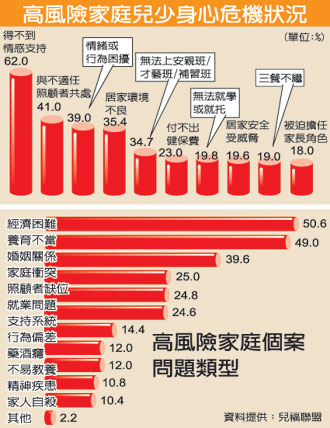 据了解,这些高风险家庭,有25%处于大人离家出走、重大伤病、死亡或入监服刑的状态;超过4成以上的孩子经常单独在家,或与重病、酗酒、毒瘾、罹患精神疾病、有自杀倾向或纪录的家人共处。换句话说,这些家长大多缺乏照顾子女的能力,甚至还可能伤害孩子。