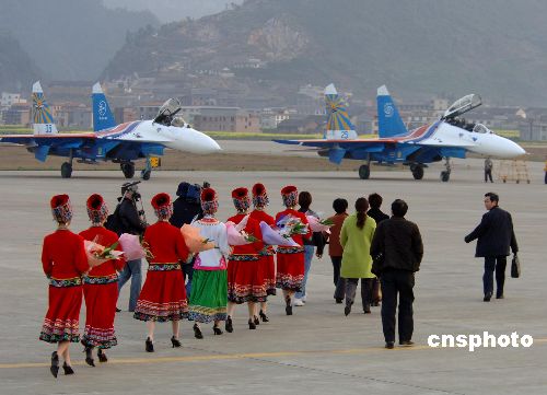 十五日傍晚,俄罗斯空军“勇士”飞行表演队五架苏-27战机终于在众人的盼望中徐徐降落在张家界荷花机场。他们将在未来的几天里在此进行编队、翻筋斗、盘旋、跌升急降等精彩特技表演。图为张家界土家族姑娘身穿民族服装欢迎俄飞行员。作者:王丽南