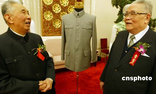 三月二十一日,著名的民族品牌——北京红都时装公司经过半个世纪的承载,迎来了上海迁京五十年的庆典佳日,来自社会各界的新朋老友聚集一起在人民大会堂共同感受五十年的风雨历程。曾于一九五七年四月为毛泽东主席设计“毛式中山装”的田阿桐(右)老人也出席了庆典。他被称为“毛式中山装”的创始人。作者:任海霞