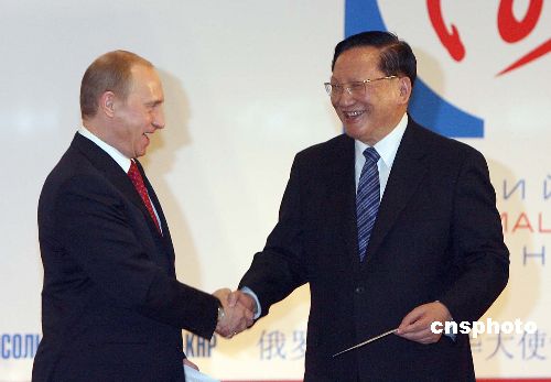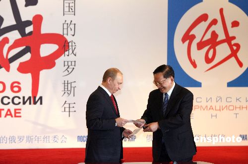 3月21日,中国国务委员唐家璇与俄罗斯总统普京共同出席在北京举行的“俄罗斯年”新闻中心启用仪式,双方在纪念封上签名留念。作者:廖文静