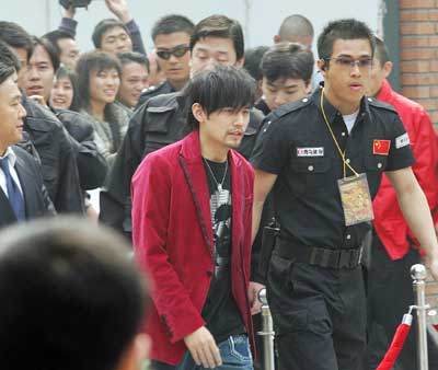 中新网3月22日电 据北京娱乐信报报道,事隔十天,张艺谋新片《满城尽带黄金甲》昨天在北京电影制片厂又举行了一场新闻发布会。相对于之前发布会巩俐、周润发齐齐亮相,昨天影片见面会的最大主角就是刚进组没几日的周杰伦,而这也是他的首次曝光。