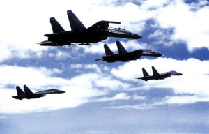 说时迟、那时快,“红军”编队迅速分开,加大油门、实施干扰,以迅雷不及掩耳之势直冲过去。不明真相的“蓝军”却还正在慢慢地缩小自己的包围圈。未等“蓝军”反应过来,“红军”编队已掉转机头,对“蓝军”的一个双机编队形成尾随态势,抢先占位,准备攻击。此时,地面指挥室大屏幕上显示的“红”、“蓝”两军对阵轨迹赢得了指挥员们一阵叫好。