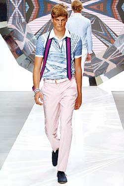 运动感觉是这个春夏男装给人的强烈感受。团队运动成为这一主题的灵魂,大量充斥着海军蓝、灰银色与其他火热的色彩,令人联想到巴西,想到足球运动中的红、黄、绿。在面料功能性方面推出透气的涂层、可调温的纤维、透湿处理技术,令男人在运动中更加舒适。精致的街头运动色彩也令人耳目一新,白色的加入提亮了整组色彩,并且带来了乐观情绪。田径服的样式运用到时装中,轻松而亲切。在这一季运动装中则更强调海军蓝。