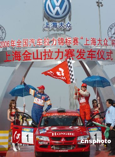 2006年全国汽车拉力锦标赛第一站24日在上海金山区举行发车仪式﹐来自全国各地的70多辆赛车100多名车手参加本站比赛。中国汽车运动联合会副主席陈学众为1号赛车﹑云南红河车队的徐浪发车。作者:赵振清