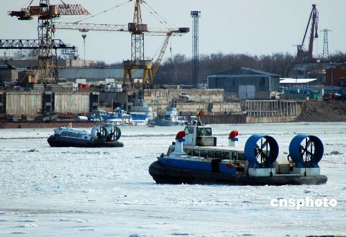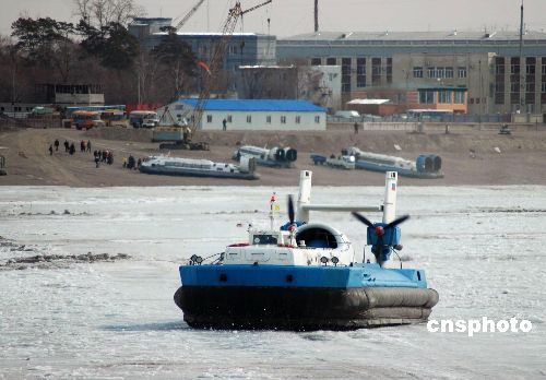 3月25日,中俄气垫船穿梭在界河黑龙江上,运送中国黑河与俄罗斯布拉戈维申斯克市进出境的两国游客。这是中俄互办“国家年”后,首次开通气垫船。由于俄方来黑河人员增多,双方共出动10艘气垫船,当日运送进出境旅客共3740人。作者:邱齐龙