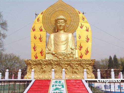 | 3月26日,一座“镀金”的仿照龙门石窟卢舍那大佛制作的彩灯落户洛阳王城公园正门广场,引起众多游人和市民的关注。洛阳为迎接将在4月5日开幕的第24届牡丹灯会,组织能工巧匠经过几个月精心准备终于将仿龙门石窟卢舍那大佛彩灯制作并安装到位。龙门大佛彩灯高20米,全身喷涂金色,在阳光下熠熠生辉,昼间大佛头顶光环闪烁,主体金光四射,主像面部丰满圆润,眉如弯月,目光慈祥,表情含蓄而神秘,严肃中带有慈祥,游人无不对仿制工人高超技艺叹服。作者:巩卫东