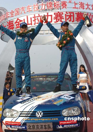 2006年全国汽车拉力锦标赛经过两天的激烈较量﹐26日在上海金山区结束﹐北京庆洋拉力车队任志国夺得1.6L组冠军﹐队友陈德安夺得季军﹐车队夺得团体冠军。作者:赵振清