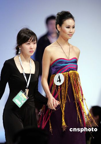 “汉帛奖”第十四届国际青年时装设计师作品大赛三月二十六日在中国国际时装周二零零六/二零零七秋冬系列发布会上举行,中国澳门选手鲍雅茵(左)与她设计的作品“爱与激情二零零六”参加比赛。作者:毛建军