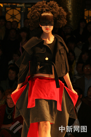 中新网3月27日电 2006年3月26日晚,正在北京举办的2006/2007中国国际时装周上,北京服装学院举行2006届毕业生专场时装发布会。图为模特在展示该校学生的另类设计作品。
