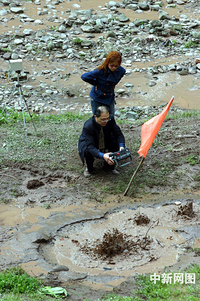 三月二十七日十点,中石油开县罗家2井压井封堵工作开始实施,但在井漏现场附近河边仍有气泡冒出。 三月二十五日,位于重庆市开县高桥镇的罗家二井发生天然气泄漏。图为技术人员正在监测,河边仍可见气泡冒出。
