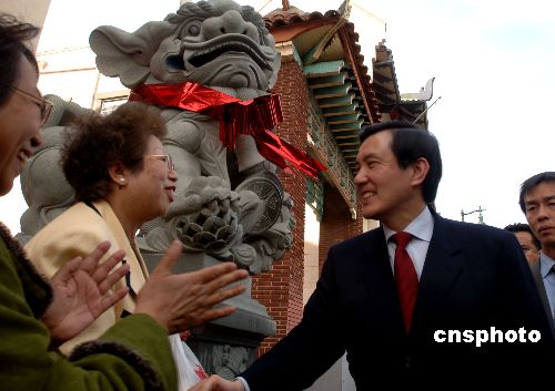 3月26日飞抵美国洛杉矶访问的中国国民党主席、台北市长马英九,中午到中国城向孙中山先生铜像敬献花圈后,沿街步行看望当地华人侨胞。作者:贾国荣