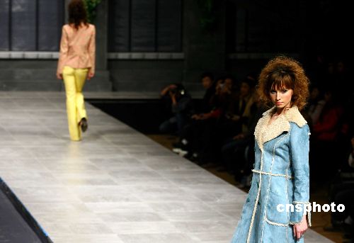 三月二十七日,爱登堡英伦风尚休闲男装2006/2007年秋冬流行趋势发布会在北京举行,时装设计将传统英式特质与现代感相互交融,回归八十年代的潮流,并以一种注重简单、安逸、活力及主宰力融合的男性形象出现,展现出优雅、简洁、时尚的英伦风情。图为两位女模特为男装发布会助阵,共同演绎英伦风情。 作者:盛佳鹏
