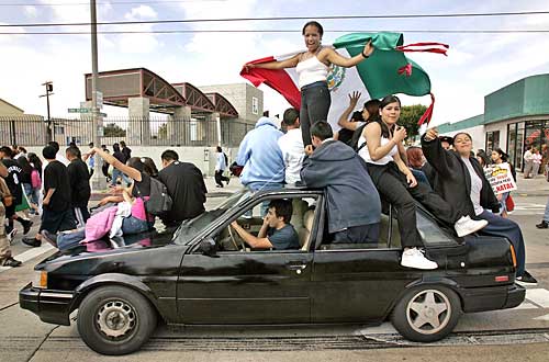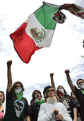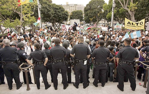 中新网3月28日电 据美国《洛杉矶时报》报道:当地时间3月28日,大量学生、外国移民及其支持者走上美国各地街头举行示威活动,抗议美国国会正在讨论的一项旨在从重打击非法移民的新法案。在外来移民比较集中的洛杉矶,数千名学生走出校门,抗议国会的这一法案。在游行示威中,学生和警察发生冲突,有部分学生被捕。(章田/雅龙)