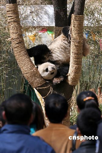 3月28日,来自四川成都的大熊猫“哈兰”在无锡锡惠名胜区动物园的熊猫馆首次与广大游客见面。“哈兰”于27日下午搭乘东方航空公司的航班抵达无锡,很快就适应了动物园新家的环境。按计划,它将在无锡“客居”一年。首次来无锡的大熊猫“哈兰”今年已22岁,在全球大熊猫谱系中的编号为287,体重100公斤。“哈兰”是成都大熊猫繁育研究基地有名的“英雄父亲”,已繁育了19胎共25个后代。作者:宦玮