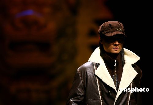 三月二十八日,中国国际时装周在北京继续上演精彩的秋冬时装流行趋势发布表演,在“圣达威”二零零六/二零零七秋冬男装发布会上,模特身着时尚服装走过巨大狮子的背景,浑身充满了野性味道。作者:盛佳鹏