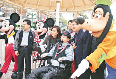 全身瘫痪病人邓绍斌(斌仔)昨日首次离开医院,在主诊医生、医院管理局主席胡定旭、父母及亲友合共二十五人爱心拥护下,达成到访香港迪斯尼乐园的心愿,接受米奇老鼠和米妮亲吻之余,又能够观看立体电影,朝气勃勃的斌仔全程笑不停,不停拍照留下欢乐的时刻。