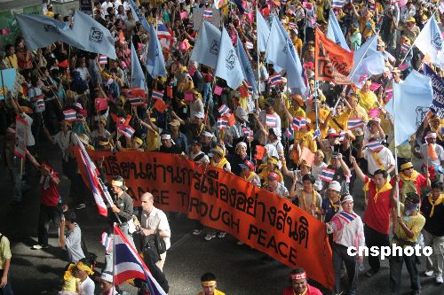 在泰国全国大选即将到来之际,首都曼谷二十九日爆发新一波反政府集会,要求塔信辞职的反政府人士在游行中打出了“通过和平来改变”的横幅。持续近两个月的反政府集会迄今一直和平进行,并未发生暴力冲突。作者:罗钦文