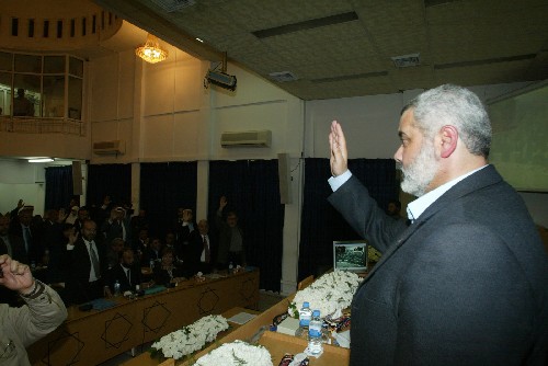 由于以色列的封锁,就职仪式分别在加沙和约旦河西岸城市拉姆安拉两地举行。巴新政府总理伊斯梅尔·哈尼亚、外交部长马哈茂德·扎哈尔、内政部长赛义德·赛亚姆等10名成员在加沙宣誓就职,而财政部长奥马尔·阿卜杜勒·拉齐克等14名成员在拉姆安拉宣誓就职。