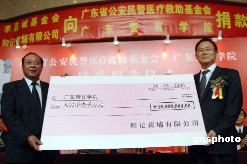 据介绍,李嘉诚先生多年来致力推动社会建立“奉献文化”,不断支持教育、医疗、文化及公益事业,至今向内地捐款达七十六亿港元。当他得知广东省公安厅刚成立广东省公安民警医疗救助基金会基金不足和广东警官学院筹建游泳馆遇到资金难题的情况后,立即给予支持。