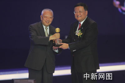“凤凰因你而美丽——凤凰卫视十周年庆典晚会”3月31日晚间在香港亚洲国际博览馆举行,来自世界各地的名人、明星云集于此。晚会特别设立了“十年成就凤凰大奖”。图为凤凰卫视董事局主席行政总裁刘长乐向为香港的繁荣稳定付出辛劳的全国政协副主席、前香港特首董建华先生颁发奖项。(凤凰卫视供图)