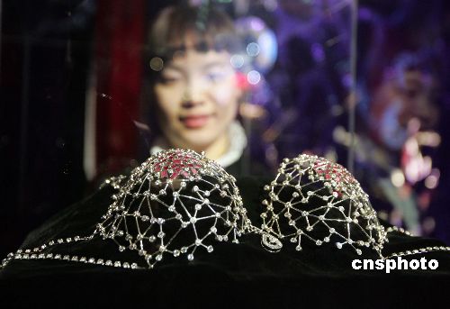 四月一日,中国第一场内衣艺术视觉展“梦幻伊甸”,在中国第一商业街王府井举行,掀起“爱慕.美丽中国行”时尚风暴。展览中的一款钻石文胸令参观者惊羡。这款文胸采用比利时精细切割工艺的珍贵南非钻石镶嵌,配以五十颗泰国红宝石,耗用三百多克白金。作者:毛建军