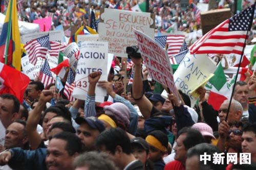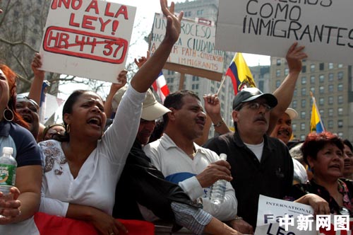 四月一日,纽约各族裔移民团体汇聚在一起,举行声势浩大的示威游行,抗议美国众议院不久前通过的一项打击非法移民的新法案。 作者 谭宏伟