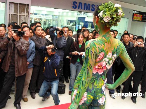 4月1日,青岛东部一家商场内展示一幅绘制在女模特身上的《国色天香图》,别具一格的人体彩绘吸引了众多市民观赏。据悉,这次人体彩绘展示是一家厂商为推介刚上市的新型显示器举办的,观众可以将模特身上艳丽的色彩和显示器中直播的色彩做比较,突出显示器的超强色彩还原能力。作者:赵健鹏