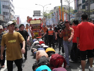 中新网4月3日电 台中县大甲镇澜宫妈祖八天七夜南下新港乡奉天宫绕境进香,神銮于2日下午在信徒簇拥下回銮,绕境大甲镇市区,所到之处万人空巷,鞭炮、电光炮、冲天炮震耳欲聋,民俗阵头热烈参与,队伍长达十余公里,声势浩大,直到晚间十时半举行安座仪式后,方才结束一年一度的绕境进香盛况。
