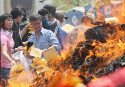 中新网4月3日电 适逢周末,台北市富德公墓这两天一早便出现扫墓人潮,在熊熊大火的金纸堆前民众虔诚烧纸给往生的亲人于天国花用。(台湾《中国时报》图 陈怡诚摄)