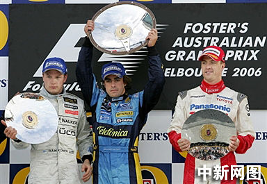 4月2日,西班牙车手阿隆索(中)再次获得澳大利亚一级方程式赛车冠军,亚军为芬兰选手吉米-雷克南(左),季军为德国选手拉-舒马赫(右)。
