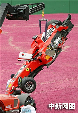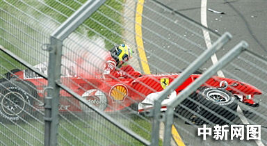 4月2日在墨尔本举行的澳大利亚一级方程式车赛上,巴西选手马萨撞在了前方德国选手罗斯博格的赛车上,从法拉利中摔出。