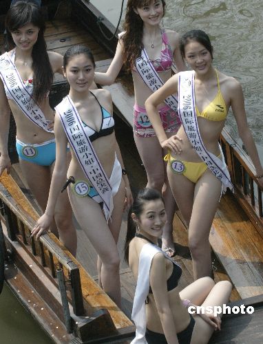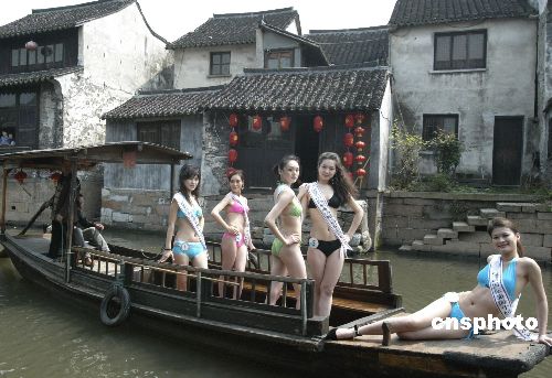 4月3日,正在浙江古镇西塘参加“2006国际旅游小姐中国区总决赛”的39位佳丽来到西塘外景拍摄,图为佳丽们身穿比基尼展示风采。作者:钱兴强