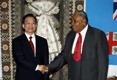 温家宝表示,斐济是中国在南太地区的重要合作伙伴,巩固和加深中斐传统友谊与合作是中国政府的既定政策。中国一贯主张国家不分大小一律平等,各国应相互尊重、平等相待、和谐共存、共同发展,中方将根据这一原则继续开展同斐济的全面合作。