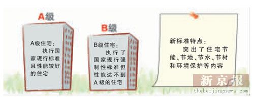 据介绍,新标准下的住宅性能按照评定得分划分为A、B两个级别,其中A级住宅为执行国家现行标准且性能较好的住宅;B级住宅为执行了国家现行强制性标准但性能达不到A级的住宅。A级住宅按照得分由低到高又分为1A、2A、3A三等。新标准突出了节能、节地、节水、节材和环境保护等内容,规定凡是达不到国家和地方政府规定的建筑节能指标要求的,均不得评定为A级住宅。