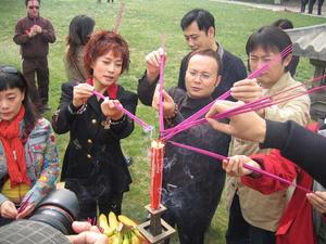 清明的西安,天气阴沉,空中不时飘着细雨,在中国这个忆祖追思的特别节日里,昨天上午十时,巨片《日月凌空》在西安大雁塔下的大唐芙蓉园秘密开机。开机前,刘晓庆率剧组演职员祭奠武则天,因为剧组一致对外称是“秘密试镜”,加上突然通知全体人员出发,故无其它媒体能够到达开机现场,本报成为现场采访和摄影的唯一媒体。