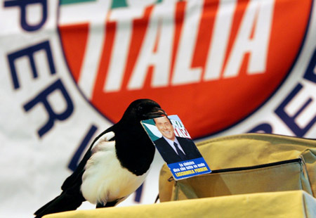中新网4月6日电 据路透社报道,4月5日,一只经人工驯养的小鸟叼着贝卢斯科尼的卡片。意大利将于4月9日至10日举行议会选举。最新民意测验表明,贝卢斯科尼领导的中右联盟的支持率目前落后于普罗迪领导的中左联盟。(春风)