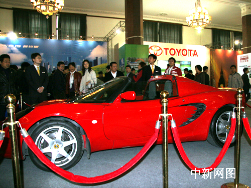 中新网4月6日电 “2006北京汽车展销会”4月6日在北京军事博物馆开幕。图为红色莲花跑车吸引众多消费者驻足观看,丰田普锐斯也以环保为买点大张旗鼓宣传。(文图/杨彦宇)