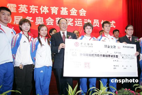 四月七日,霍英东体育基金会奖励第二十届冬奥会获奖运动员仪式在北京举行,香港体育协会暨奥委会会长霍震霆先生代表霍英东体育基金会,向都灵冬奥会夺牌的十一名中国运动员颁发了1629807港元奖金。 作者:武仲林