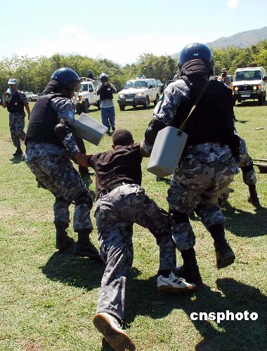 | 4月6日,联合国海地稳定团(联海团)进行了防暴演习,在海地维和的6个国家的7支维和警察防暴队和海地国家特警参加了实战演习。 在这次演习中,模拟了中国防暴队保卫的计票中心遭到游行示威的海地各党派支持者冲击计票中心时,各个国家防暴队按照统一部署,快速处置冲击计票中心的事件和太子港可能出现的骚乱事件。当天中国维和警察防暴队演练的科目是“计票中心遭到围攻后的保卫和反击”战术,随着指挥员的一声令下,中国防暴队员驾驶车辆迅速赶到演习地点,摆开战斗队形,防暴队以迅速的站位、规范的动作和良好的精神风貌赢得了全场的掌声。作者:陈进