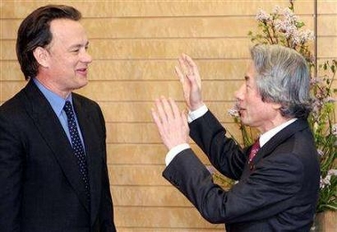 中新网4月8日电 《今日日本》报道,美国知名影星汤姆·汉克斯7日东京拜访了日本首相小泉纯一郎,两个人见面后兴致昂然的谈起了彼此的发型。汤姆·汉克斯此次来日本是为他的新片《达芬奇密码》进行宣传工作。