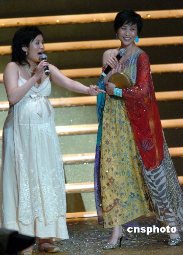 2006年度香港电影界重要奖项﹐“香港电影金像奖颁奖典礼” 4月8 日在香港红磡体育馆举行。演员梁家辉在电影《龙城岁月》中凭精湛演技获本届电影金像奖最佳男主角奖。图为主角梁家辉缺席,吴君如、刘嘉玲为其颁奖。作者:邓庆乐