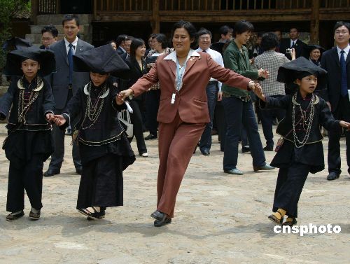 四月九日,泰国诗琳通公主访问中国广西那坡县吞力屯,和屯里的壮民翩翩起舞。作者:蒋雪林