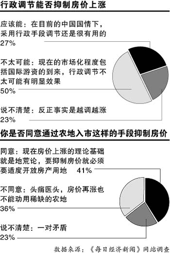 据媒体报道,政府有关部门日前首度对今年房地产调控方向定调。建设部住宅产业司司长沈建忠在8日举行的中国房地产协会第五次会员代表大会暨房地产形势报告会上表示,当前宏观调控对房地产结构性矛盾的影响并不明显,对于部分热点城市,将动用行政手段予以调节。近日,国家税务总局将预售收入所得税上调5%。另有报道说,农村集体土地将可能作为一个手段直接入市,并可用作房地产开发。究竟行政手段能否抑制越来越不理性的房价呢?