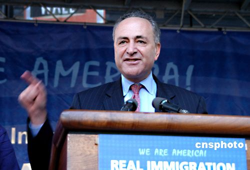 图为纽约州联邦参议员舒默现场支持抗议活动。作者:龚文谟