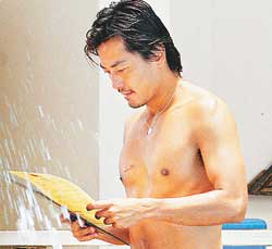 上周六(8/4),伊健与李彩华的拍摄通告安排在当天黄昏,中午11时许,伊健在经理人林珊珊陪同下,到酒店的泳池边晒太阳。约15分钟后,李彩华突然出现在泳池边,没有与伊健打招呼,便鬼鬼祟祟坐在对方身旁,若无其事各有各晒,异常陌生。
