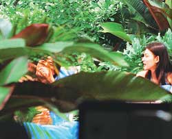干晒半小时后,伊健、李彩华及林珊珊一行3人,便到泳池旁的餐厅,穿回T-shirt的李彩华此时才稍为松懈,与伊健边吃边谈,跟之前扮陌生的态度差别很大。林珊珊见两人谈得甚为投契,为免做电灯泡亦先回酒店房,好让两人有机会独处。不过,伊健和李彩华似乎意犹未尽,吃完午餐仍未舍得回房,索性走到泳池对开的花圃继续谈天。