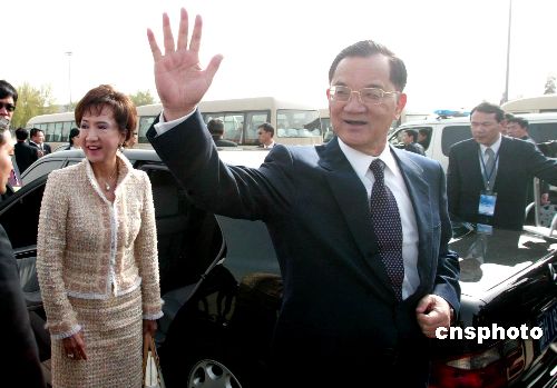 4月13日下午,国民党荣誉主席连战率团抵达北京,参加即将在北京举行的两岸经贸论坛。图为连战抵达机场后挥手致意。作者:盛佳鹏