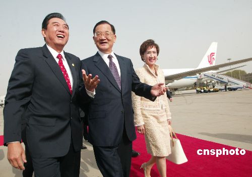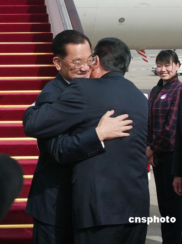 4月13日下午,国民党荣誉主席连战率团抵达北京,参加即将在北京进行的两岸经贸论坛。中共中央台湾工作办公室主任陈云林到机场迎接。作者:盛佳鹏