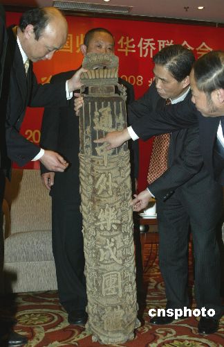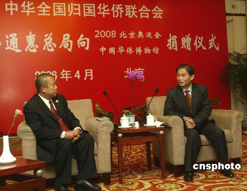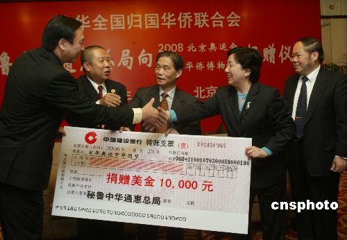 中新社北京四月十三日电 (记者 邢利宇)“秘鲁中华通惠总局向二OO八年北京奥运会、中国华侨历史博物馆捐赠仪式”今晚在北京华侨大厦举行。秘鲁中华通惠总局主席萧孝权将该会“镇会之宝”——一八八六年成立时的木匾对联赠予中国侨联正在筹建中的中国华侨历史博物馆,并请侨联向二OO八年北京奥运会转交了赠款一万美元。