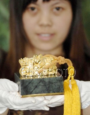 记者在现场看到,印玺以纯金纯银铸造交龙纽,嵌结碧玉座。该印玺系由中国文物保护基金会监制。